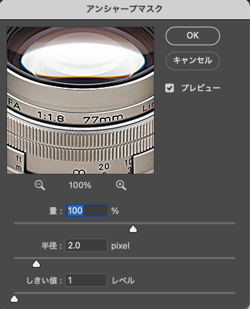 量:シャープネスの強さを調整します。数値が大きいほど輪郭がはっきりします。 半径:シャープを適用する輪郭の幅を設定します。画像が粗い場合は大きく、細かい場合は小さく設定します。 しきい値:シャープを適用するピクセルの濃度差を決定します。数値が高いほど、コントラストの高い部分にのみシャープがかかります。