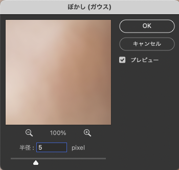 ぼかしフィルターのダイアログの画面を確認しながら数値を決めます。今回は5pixelにしました。